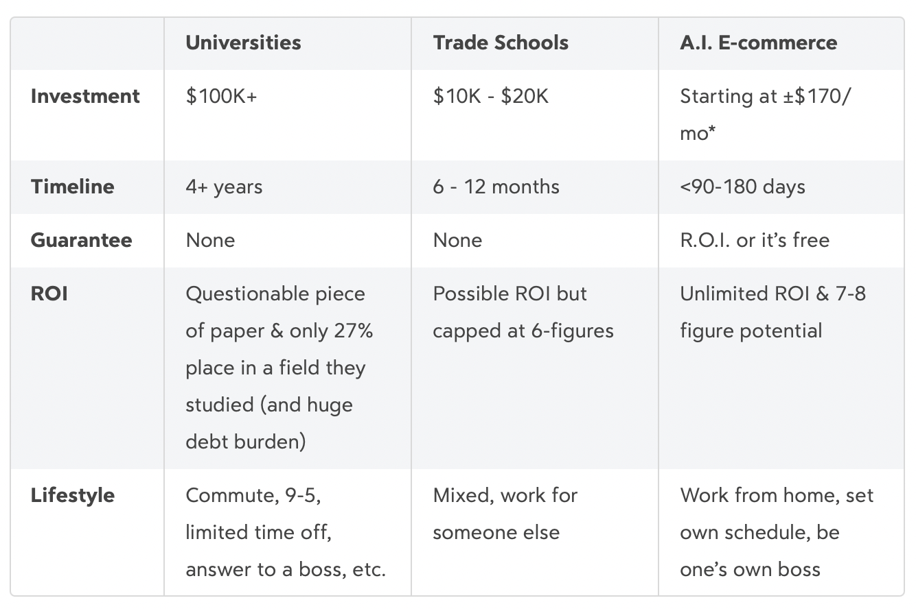 Or compare starting an AI e-com business to Uni's or trade schools.